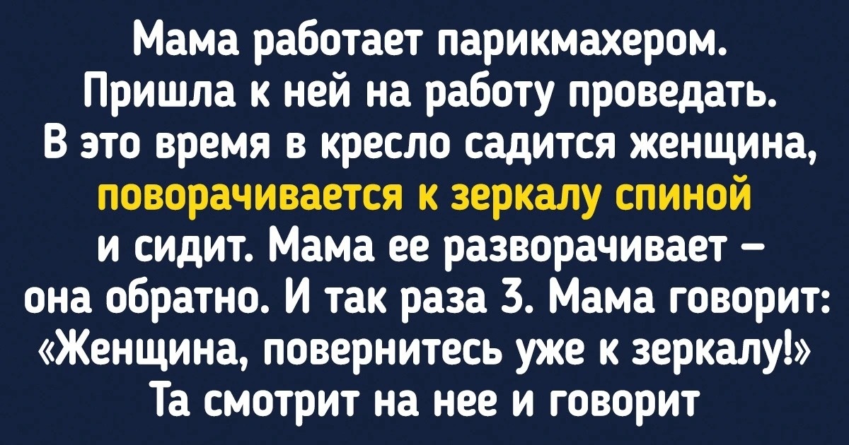 - Мама работает парикмахером. Пришла я к ней как-то на работу проведать. В это время в кресло садится женщина, поворачивается к зеркалу спиной и сидит. Мама ее поворачивает — она обратно. И так раза 3. Мама говорит: «Женщина, повернитесь вы уже к зеркалу!» Женщина смотрит на нее и говорит: «Вы что, не понимаете, я хочу как в шоу: только после стрижки увидеть себя в зеркале, а потом обрадоваться, что стала красоткой». После того как мама ее подстригла, она повернулась к зеркалу и горько заплакала.