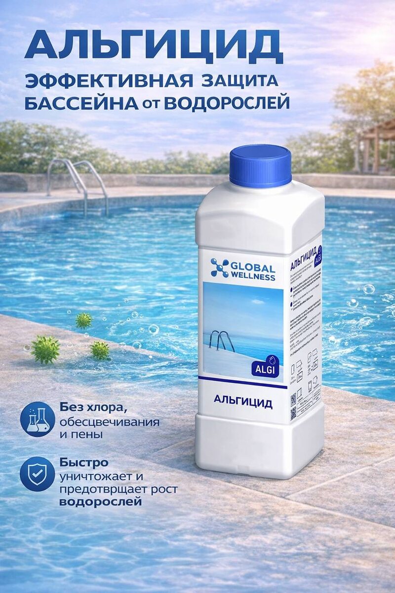 Зелёная вода — это не просто «визуальная проблема». Это сигнал о том, что система водоподготовки вышла из баланса. И если реагировать только хлором — вы боретесь не с причиной, а со следствием. Разберёмся, как это работает Что такое водоросли с точки зрения химии Водоросли — это простейшие фотосинтезирующие организмы. Им нужно всего 4 условия: •свет •тепло •вода •питательная среда (фосфаты, нитраты, органика) ➡️ В бассейне всё это есть почти всегда. Как только падает уровень дезинфекции или нарушается pH — водоросли начинают активно размножаться. Почему хлор не решает проблему полностью Частая ошибка — “заливаем больше хлора”. Но: — при высоком pH эффективность хлора падает — органика “съедает” активный хлор — часть водорослей образует защитную биоплёнку В итоге: вы тратите больше реагента, а вода всё равно мутнеет и «цветёт». Что происходит в воде без альгицида 1. Водоросли размножаются → увеличивается биомасса 2. Появляется мутность и зелёный оттенок 3. Повышается нагрузк