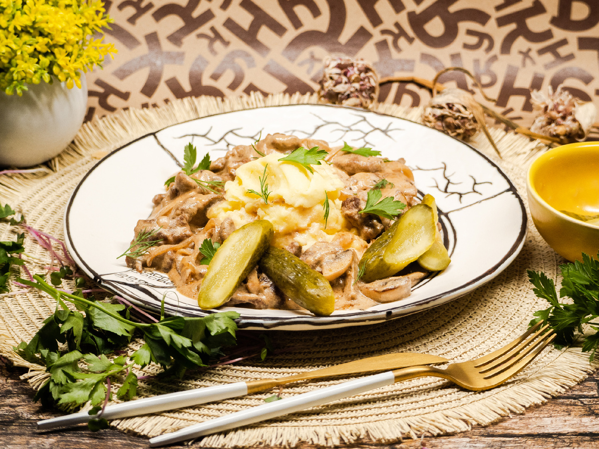 Название блюда – это смесь французского beef (говядина) и фамилии графов Строгановых. Считается, что рецепт появился в XIX веке и был связан с графом Александром Строгановым, при дворе которого работал французский повар. Так и родилось блюдо на стыке двух кухонь: французской техники и русской подачи – мясо с соусом, щедро и без церемоний. Но у классики, как всегда, есть легенды. И их несколько. Светская. Граф Строганов устраивал «открытые столы» – приемы, куда мог прийти любой прилично одетый человек. Нужно было блюдо, которое удобно подавать, легко делить и быстро готовить. Бефстроганов идеально вписался в этот формат. Драматическая. Будто бы граф в порыве эмоций «порубил» мясо саблей после личной драмы. Звучит эфф