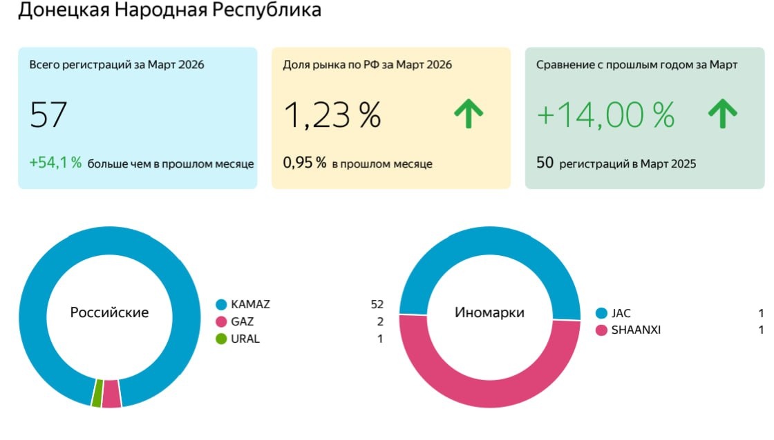 По данным «Автостат Инфо» рынок новых грузовых автомобилей в Донецкой Народной Республике в марте 2026 года показал рост как к прошлому месяцу, так и к марту 2025-го. Грузовой рынок в ДНР остается очень небольшим по объему, но при этом крайне концентрированным по структуре. За месяц в республике зарегистрировали 57 новых грузовых автомобилей против 50 годом ранее. Это дало прирост на 14%. К февралю 2026 года рынок прибавил еще сильнее — на 54,1%, а доля ДНР в общероссийском рынке новых грузовиков выросла до 1,23% против 0,95% месяцем ранее. То есть март стал месяцем ощутимого оживления и по внутренней динамике, и по положению региона в федеральной структуре. В марте 96% рынка пришлось на российские марки: 55 машин против 46 годом ранее. Иномарки, напротив, сократились с 4 до 2 единиц, а их доля снизилась с 8% до 4%. По итогам января–марта картина почти такая же: 125 российских грузовиков против 87 годом ранее, рост на 44%; иномарки — лишь 12 машин против 11. В результате квартальны