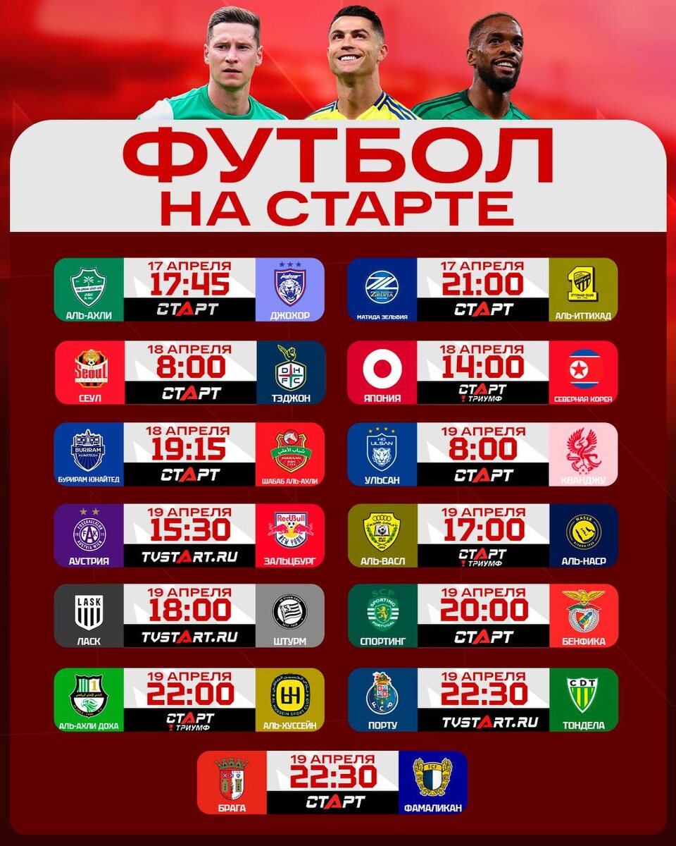 ! 13 матчей самой популярной игры вашему вниманию! От Роналду с «Аль-Насром» до зарубы «Спортинга» и «Бенфики». А завтра еще и покажем финал молодежного женского Кубка Азии 🥰 Подписывайся на ТВ СТАРТ в MAX📲