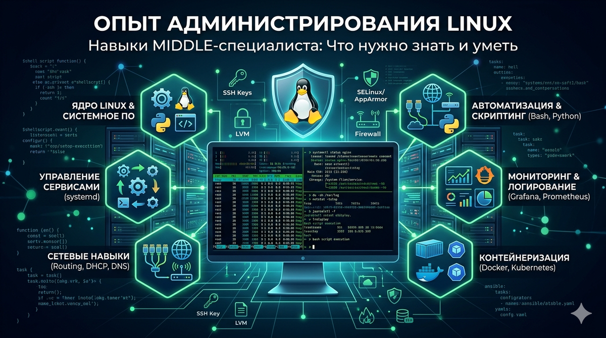 Опыт администрирования Linux на уровне middle это не просто сумма знаний, а системное мышление. Умение диагностировать сложные проблемы, автоматизировать рутину и эффективно взаимодействовать с командой. В этой статье я выделил ключевые компетенции. От глубокого понимания загрузки и сетей до владения инструментами мониторинга, контейнеризации и автоматизации. Критически важно не только знать теорию, но и уметь применять её на практике, восстанавливая системы после сбоев и документируя решения.