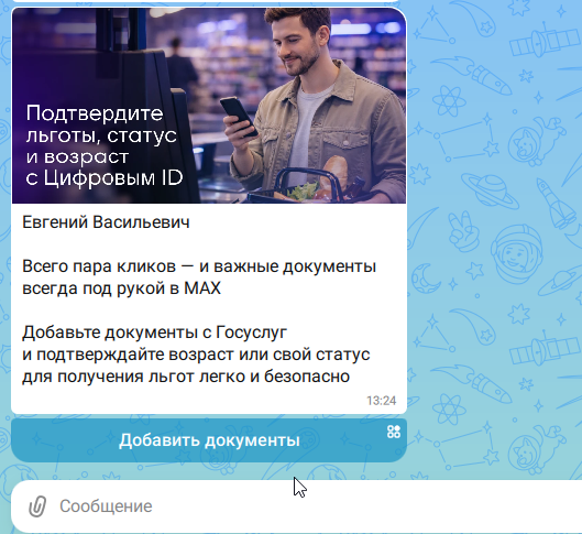 Пришло в Максе вот такое сообщение Думаю, многие такое получали. А еще по ТВ идет активная реклама типа подгрузите, загрузите, авторизуйтесь... Даже на кассах самообслуживания пишут: откройте МАКС и если есть документы предъявите их - со всех сторон нам предлагают загрузить документы в мессенджер. Согласен, это и правда очень и очень удобно, если бы не одно НО. Но почему то ДО СИХ ПОР не решен главный вопрос: а что делать в тот момент когда твой аккаунт улетит к мошенникам???!!! А аккаунты улетают только так! На раз-два! Потом их восстановить практически невозможно. По крайней мере в короткие сроки ни у кого не получалось. Да, я знаю людей у которых аккаунты увели и они не могут их восстановить до сих пор. С них пишут контактам, просят денег перевести, а еще...а еще доступ в Госуслуги у нас через МАКС! То есть подтверждается легко, быстро и безвозвратно. Вопросов к разработчикам все больше и больше. 1. Почему вы просто не скопировали телеграм со всем его прекрасным функционалом, а нача