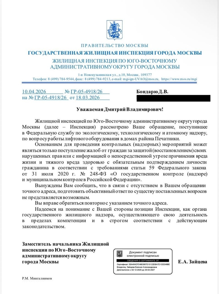 ! Посмотрите на «шедевр» бюрократии (см. фото). Мне, общественному деятелю, подавшему сигнал о системном кризисе в целом районе Печатники, пишут: «...в связи с отсутствием в Вашем обращении точного адреса, подготовить объективный ответ не представляется возможным». Мы не можем ждать, пока в каком-нибудь доме из-за некачественного обслуживания случится трагедия. Каждый сбой в работе — это нарушение наших прав на качественную коммунальную услугу, за которую люди исправно платят. Наши опасения не голословны: депутат Госдумы от ЛДПР Дмитрий Свищев уже обращал внимание на эту проблему, а прокуратура Москвы в районе Ховрино проводила проверку и подтвердила многочисленные нарушения! Возбуждены дела об административных правонарушениях: https://vk.ru/wall-191888466_33046 Там тот же сценарий: формальные отписки и реальная угроза для людей. Поэтому мы запускаем масштабный сбор фактов! Я, Бондарь Дмитрий, вместе с ЛДПР, партией, которая всегда стоит на страже интересов простых людей, запуска