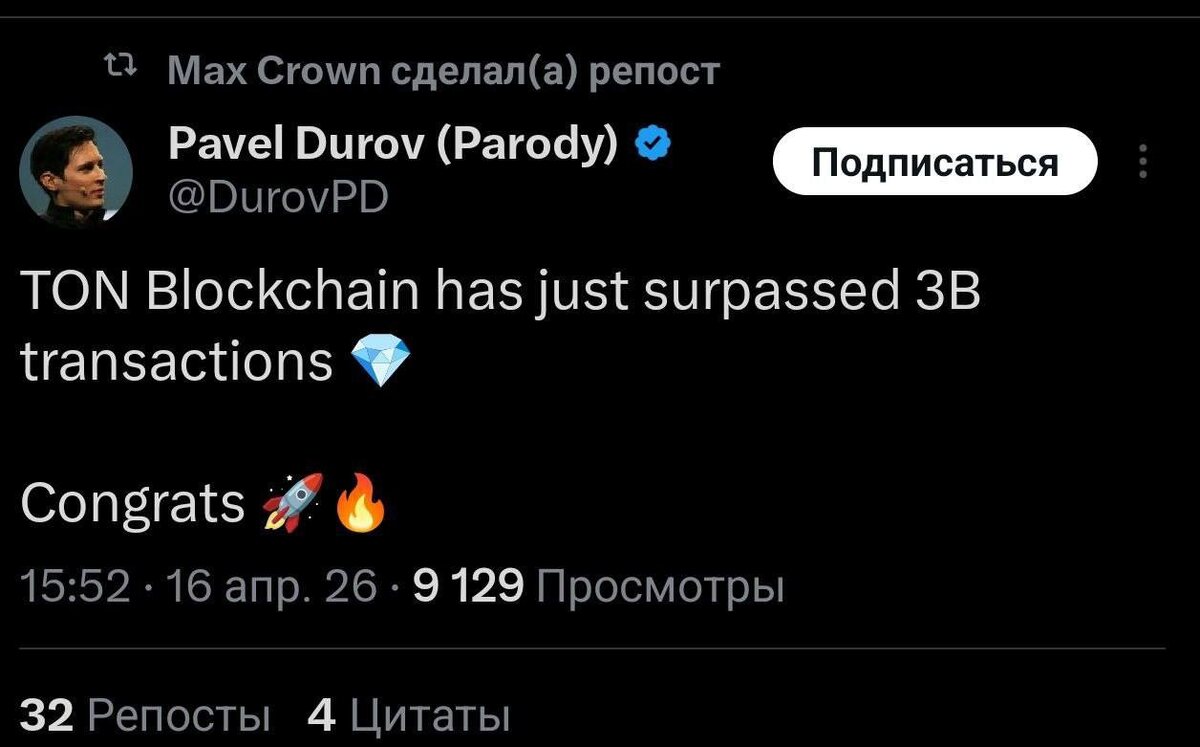 ! Еще недавно было чуть больше миллиарда, а тут сразу 3. Вот это я понимаю рост. Ну и конечно же я понимаю что это фейковый аккаунт Дурова, но репост сделал Max Crown , а он генеральный директор Ton Foundation и не стал бы репостить фейки, поэтому MTONGA!