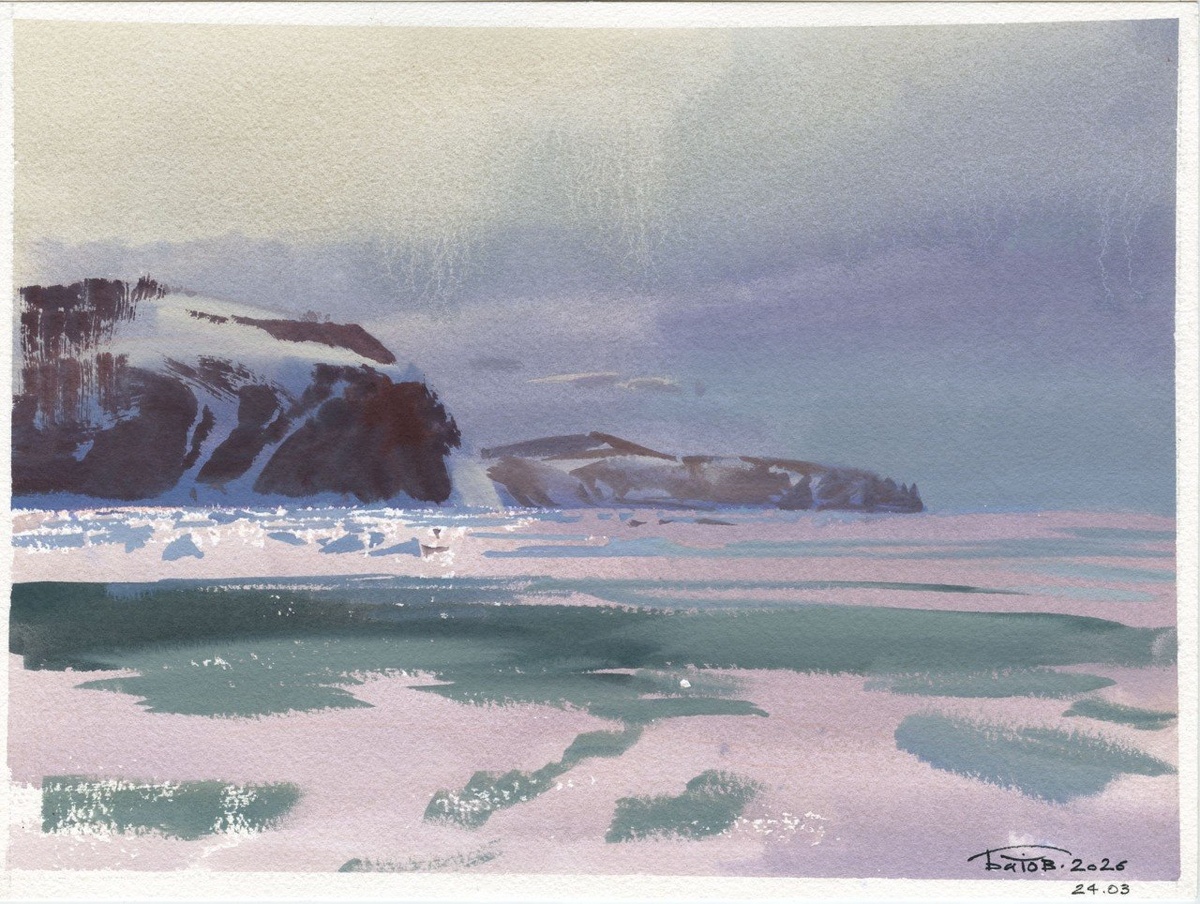 Байкал / Near Cape Khoboy. Baikal / 27,5x37 / Gouache Plein air painting. Высушенная гуашь с водкой. Фотографии практически не передают маштаба впечатления. На контражурных снимках особенно заметно "съедается" воздушная перспектива, из-за чистого воздуха сближаются планы, обобщаются цвета. Работа с натуры — это, как теперь говорят, "вызов", проверка способностей интерперетации и владения материалом, достаточного для адекватного воплощениия впечатлений на листе. #Pinax_Extra #palazzo_watercolor_paper #Baikal #пленэр #гуашь #этюды #watercolor #gouache #Байкал #Ольхон