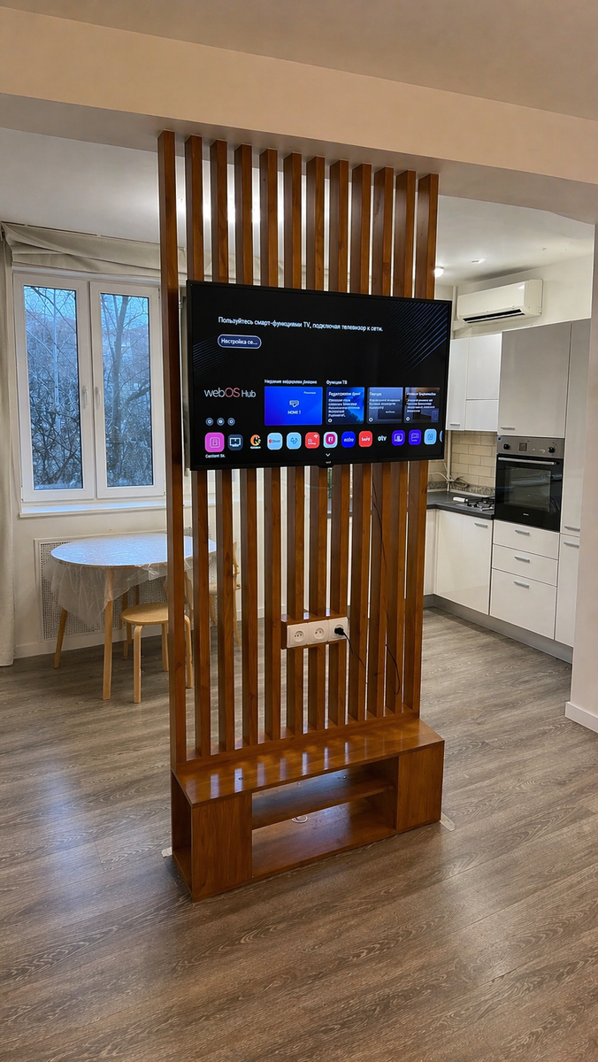 Современные интерьеры всё чаще уходят от глухих перегородок в пользу лёгких и функциональных решений. Одно из таких — ТВ-перегородка из натурального дерева, которая не просто делит пространство, а делает его визуально дороже и продуманнее.