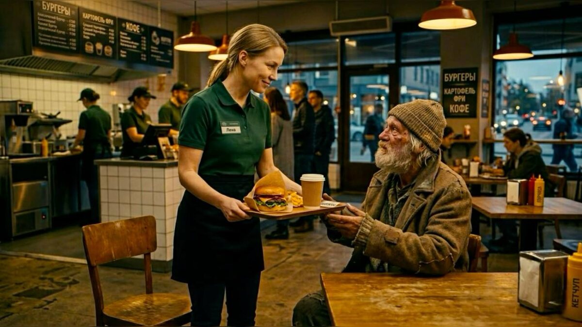 Лена молча пробила комбо-обед за 420 рублей. Сама. Накрыла поднос, положила лишнюю салфетку и отнесла старику в дальний угол. Он ел медленно, прикрыв глаза. А когда уходил, положил ей на ладонь старую медную монету.
