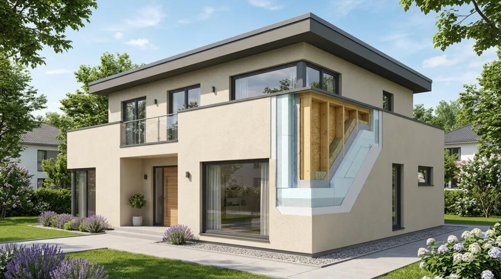 Утеплённый фасад — тонкий слой плит между несущей стеной и декоративной штукатуркой, который сокращает теплопотери в 3–4 раза