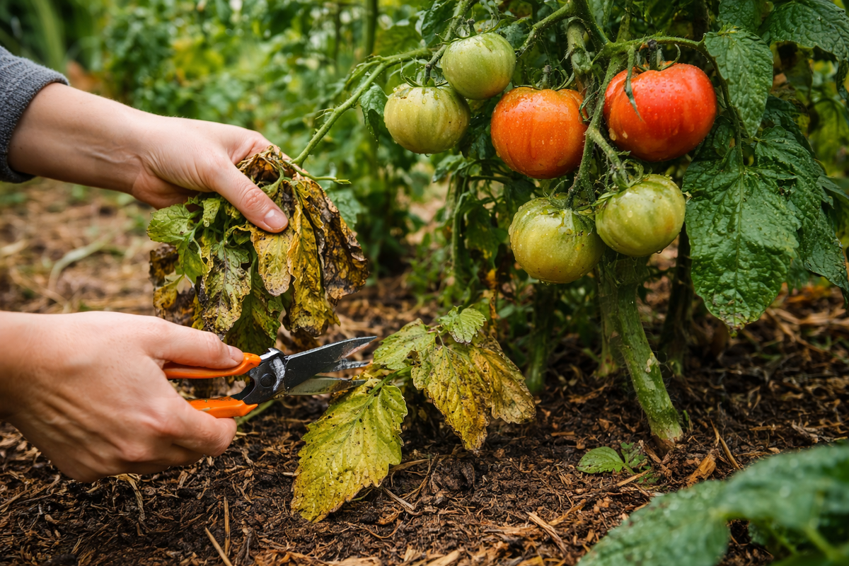 Если томаты ещё мокрые, не стоит сразу идти их пасынковать, обрезать, подвязывать и перебирать руками. Когда растение сырое, любые прикосновения только увеличивают риск разнести проблему дальше. Лучше дождаться, пока кусты просохнут, и уже потом спокойно заниматься всем, что нужно.