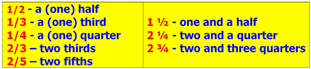 Числительные в английском довольно обширная тема. Однако в этой статья речь пойдёт о дробях. В шестом классе в учебнике Spotlight дети сталкиваются с этой темой, но подробного объяснения там нет. Давайте сразу перейдём к примерам. 1/2 – a (one) half 1/3 – a (one) third 1/4 – a (one) quarter (a fourth - in the USA) 1/5 – a (one) fifth 1/6 – a (one) sixth 1/7 – a (one) seventh 1/8 – a (one) eighth 1/9 – a (one) ninth 1/10 – a (one) tenth Как видно из примеров в числителе используется количественное числительное, а в знаменателе – порядковое. Давайте рассмотрим другие примеры. 2/3 – two thirds 2/4 – two quarters (fourths - in the USA) 3/5 – three fifths 4/7 – four sevenths Если числитель больше чем единица, то в знаменателе порядковое числительное ставится во множественное число. И рассмотрим примеры дробей с целой частью. 1 ½ - one and a half 2 ¼ - two and a quarter (a fourth - in the USA) 2 ¾ - two and three quarters (fourths - in the USA) 3 4/5 – three and four fifths 4 2/3 – four and