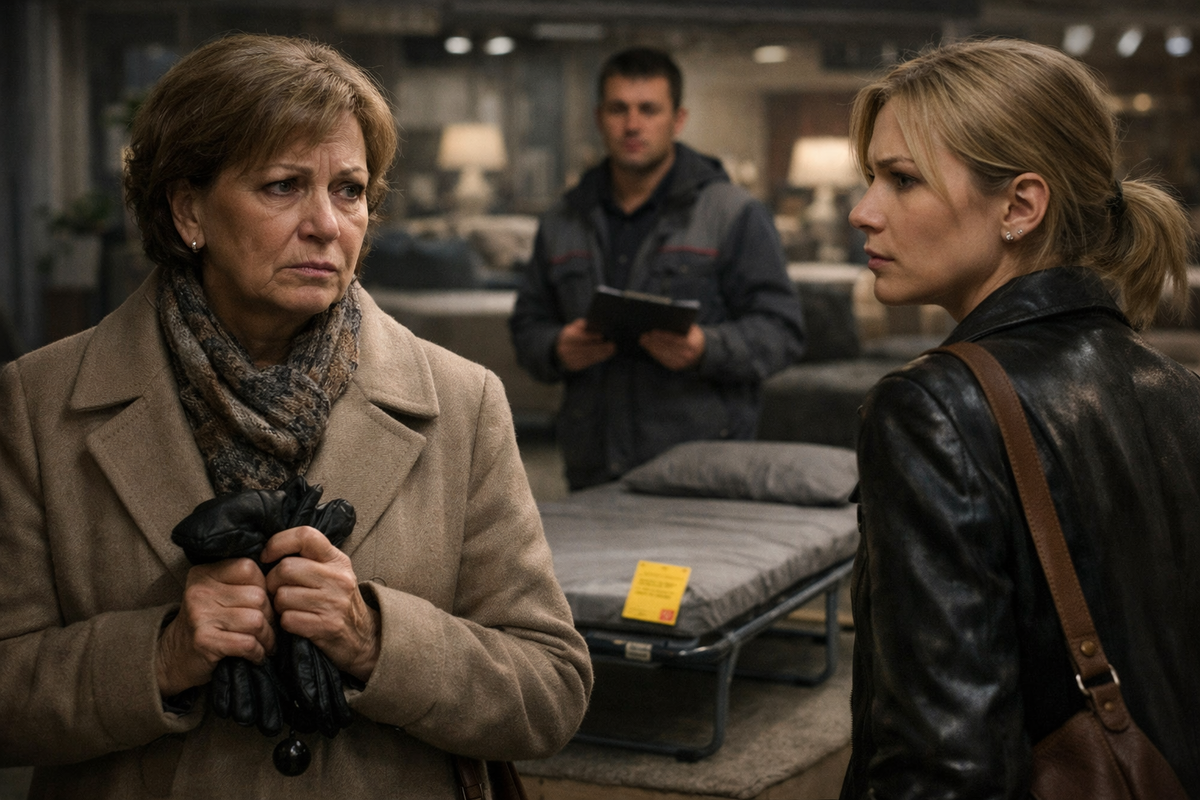 Ирина Сергеевна стояла посреди мебельного салона, держала в руках перчатки и смотрела не на раскладушку, а на ценник, приклеенный к металлической ножке. Ценник был ярко-жёлтый, будто специально кричал на весь зал о дешевизне. Рядом тянулись ряды диванов, шкафов, кроватей с мягкими изголовьями, комодов, на которых стояли лампы и искусственные ветки эвкалипта. Всё вокруг было устроено так, чтобы человеку хотелось жить красиво и спокойно. И только у раскладушки был вид временный, больничный, чужой.