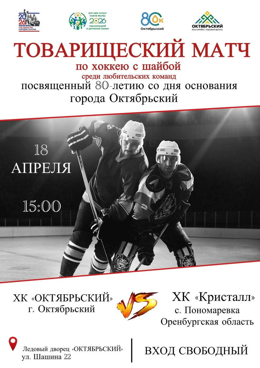 18 апреля, в 15.00, в Ледовом дворце состоится товарищеский матч любителей хоккея из Октябрьского и села Пономарёвка Оренбургской области. (18+) Соревнования посвящены 80-летию Октябрьского. Вход свободный. Автор: Надежда Переведенцева