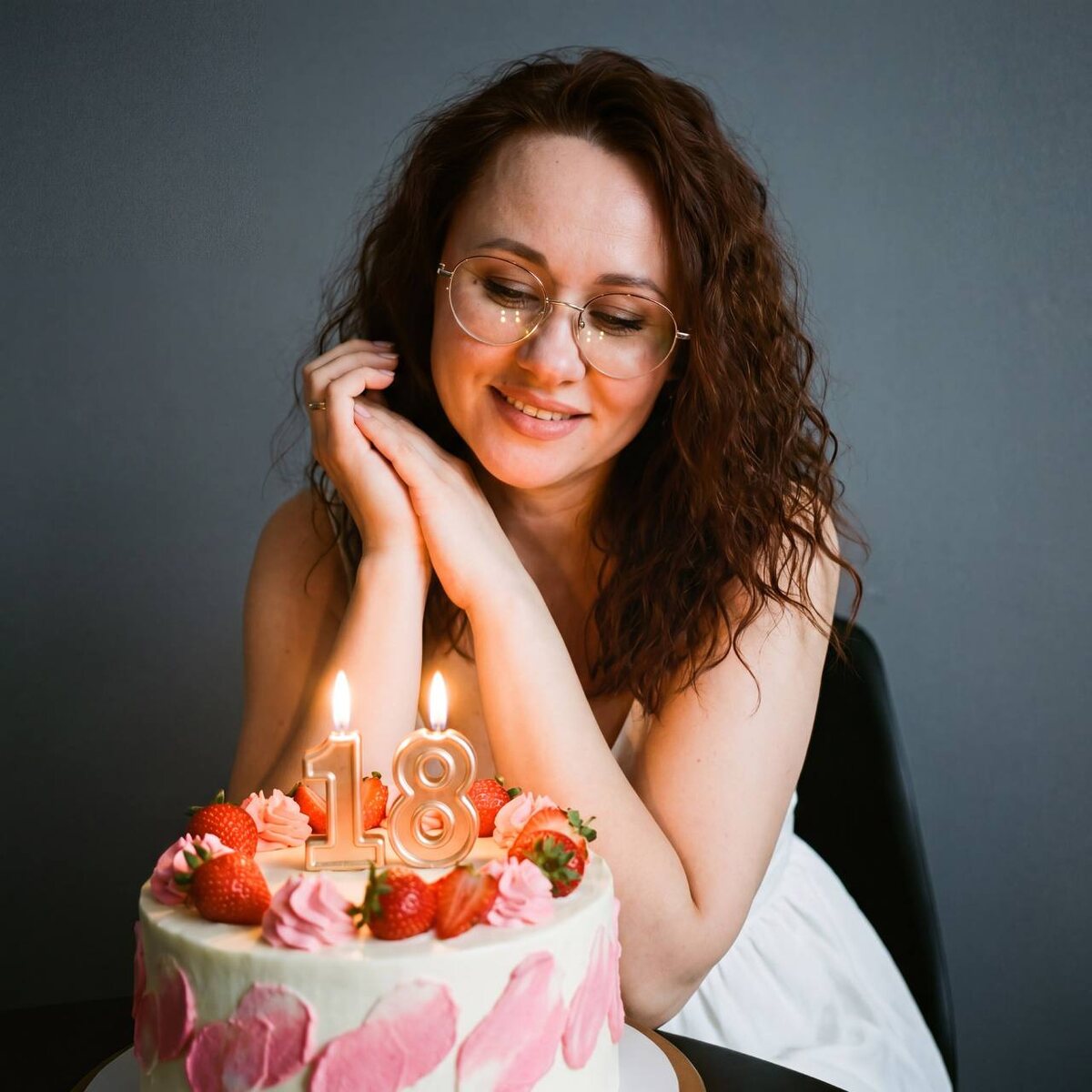 🍰 Используя представленное фото, не меняя черт лица , создай реалистичное фото девушки в день рождения Фон темно серая стена однотонная Легкая зернистость снимка Очень Близкий кадр по грудь Она сидит и смотрит на торт с бело розовым кремом который стоит перед ней - с клубникой и зажжёнными свечами в виде цифр 18. На ней белое платье Руки согнула и держит у лица с одной стороны смотря на свечи Формат 9:16 Волосы распущенные с мелкими естественными кудрями Не меняй черты лица Улыбается без Зубов