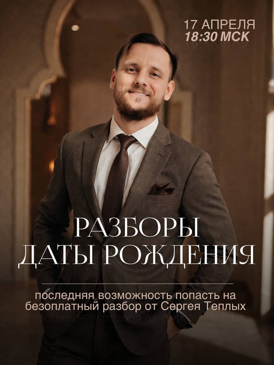 Друзья, сегодня пройдут открытые разборы по дате рождения от Сергея Теплых! ‼️ Это последняя возможность попасть на безоплатный разбор! В ближайшие полгода их не будет! Разборы пройдут сегодня в 18:30 МСК, присоединиться можно на двух площадках: 📲 Instagram 📲 VK Готовьте свои кейсы и вопросы, делитесь новостью с близкими и присоединяйтесь — будет мощный прямой эфир 🔥