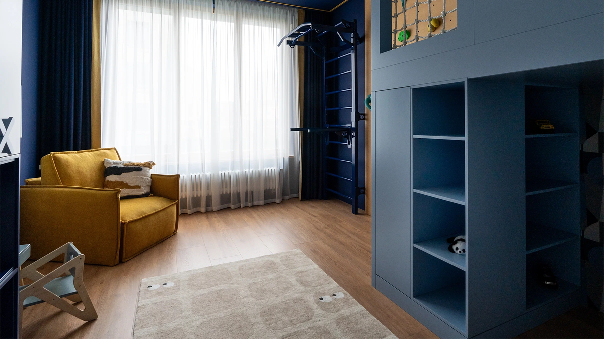 На момент работы над проектом ребёнку было всего три года, но родители сразу обозначили приоритет: его комната должна поддерживать активность. Не стандартная шведская стенка для галочки, а полноценная зона, где можно лазить, висеть, карабкаться. В семье спортивный папа, и для него было важно, чтобы интерес к движению появился у сына в раннем возрасте. Он даже сам заказал комплекс с перекладинами и турником на Яндекс Маркете за 35 тыс. рублей. А вот скалодром, систему хранения и двухъярусную кровать спроектировало уже наше бюро.
