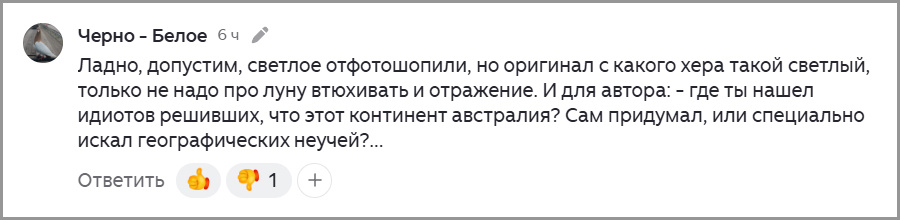 Сегодняшняя статья является продолжением прошлой публикации: Кстати, данной статьи быть не должно по той простой причине, что останавливаться на фотографии Земли с Африкой, которую в Сети приняли за Австралию, я вообще не планировал. Вроде бы разобрались с ней и можно двигаться дальше. Однако всё оказалось не совсем так, как я говорил в прошлой статье. Поэтому в сегодняшней статье расставим все точки над «i». Итак, поводом глубже покопаться с фоткой послужил комментарий читателя. Впрочем, с комментариев и начнём. Нашёл в Глобальной Сети Интернет. Специально не искал, сами нашлись. Ничего не выдумывал. Просто-напросто с фоткой наши взгляды совпали, только и всего. Зато по другим аспектам лунной программы наши точки зрения кардинально расходятся. И даже когда начинаешь глубже разбираться со снимком Земли, появляются новые вопросы. Странная позиция – полезный комментарий читатель удалил, зато язвительный оставил. Ну а теперь ещё один комментарий, который стал темой сегодняшней статьи: Пов