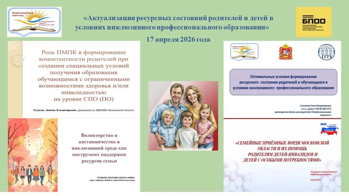 📅 17 апреля 2026 года состоялся веб-семинар для родителей, организованный ГОУ ВО МО «Государственный гуманитарно-технологический университет» (ГОУ ВО МО «ГГТУ»), Школой родителей студентов с ОВЗ и инвалидностью «Профессиональные горизонты» и Центром инклюзивного профессионального образования БПОО ГАПОУ МО «ПК «Энергия». 👥 В мероприятии приняли участие более 100 чел. Были приглашены родители и члены семей лиц с инвалидностью и ОВЗ, педагоги-психологи, социальные педагоги, тьюторы, преподаватели, социальные партнеры профессиональных образовательных организаций и организаций высшего образования. 🎤 В ходе веб-семинара выступили: • Масловская Татьяна Витальевна (руководитель ЦИПО ГАПОУ МО «ПК «Энергия») - Приветственное слово. • Селезнева Елена Владимировна (доцент кафедры общей и социальной педагогики ГОУ ВО МО ГГТУ, руководитель Школы родителей студентов с ОВЗ и инвалидностью «Профессиональные горизонты») - Оптимальные условия формирования ресурсного состояния родителей и обучающихся в