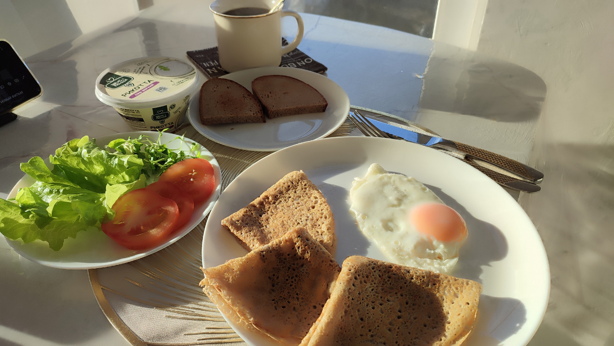 На завтрак у меня блины, так как оставалось тесто и его надо было использовать. Пожарила тосты. К ним — рикотта, помидоры, лист салата, жареное яйцо и кофе.