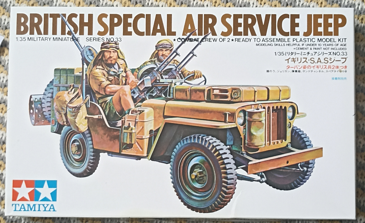 Здравствуйте товарищи! Предлагаю вам к обзору набор от фирмы Tamiya, джип Специальной авиационной службы Великобритании. Набор старенький, впервые выпущен в 1974 году!
