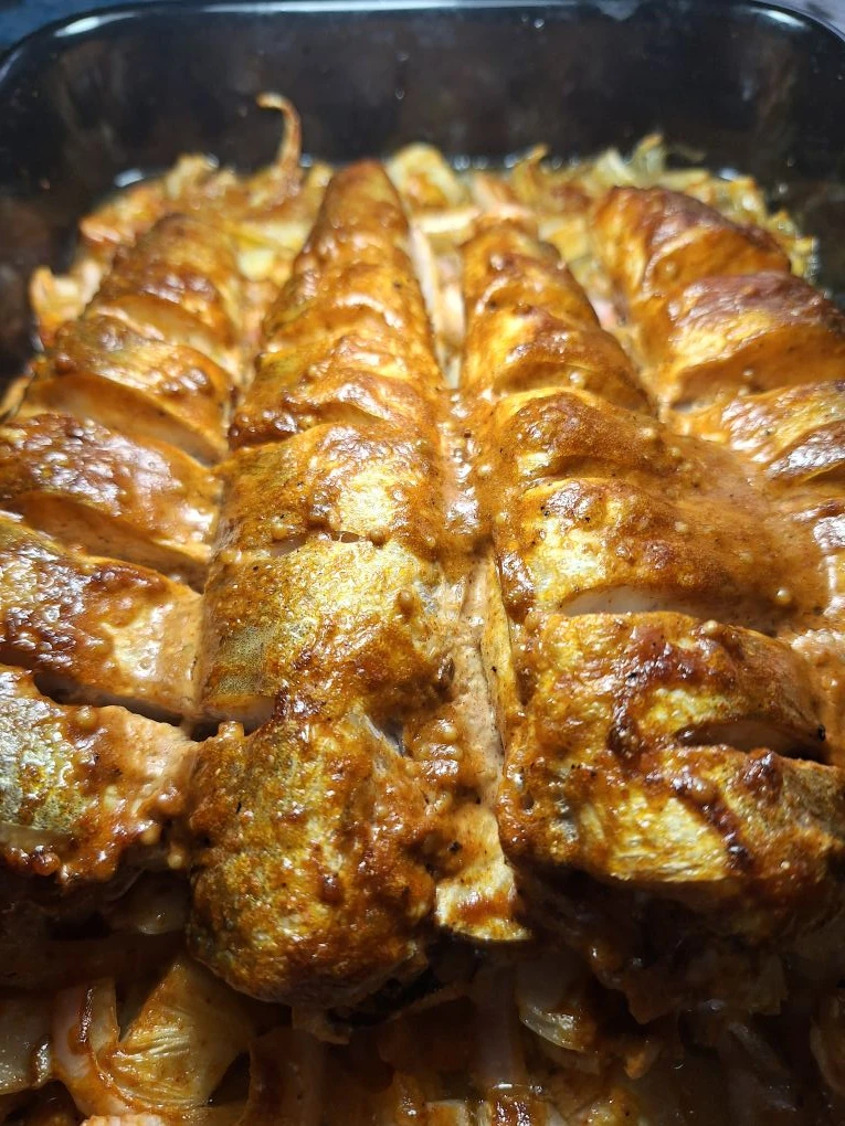 В форму для запекания первым слоем выкладываем маринованный лук, затем рыбу и в брюшко рыбы кладем кусочки сл.масла. Отправляем запекаться при температуре 200 гр 30-40 минут. Затем достаем из духовки и промазывае