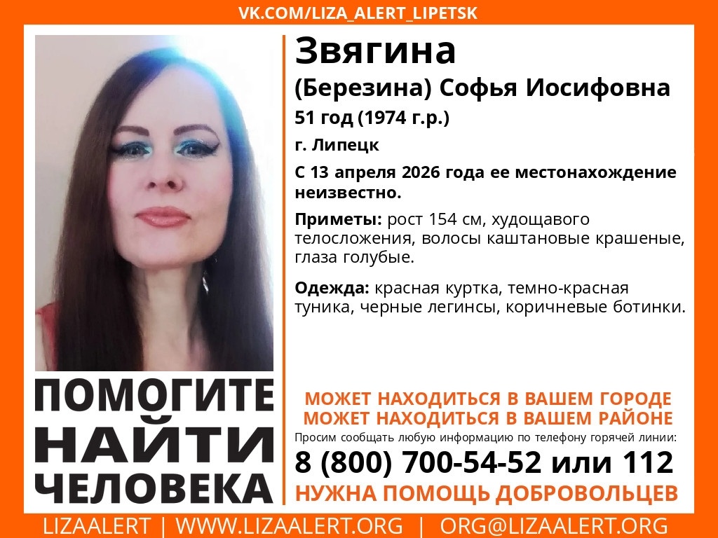 В Липецкой области начались поиски 51-летней Софьи Иосифовны Звягиной (Березиной). В начале текущей недели, 13 апреля, женщина пропала в областном центре. С тех пор о ее местонахождении ничего не известно, уточнили волонтеры поисково-спасательного отряда «Лиза Алерт». Приметы Софьи Иосифовны: рост 154 сантиметра, телосложение худощавое, волосы окрашенные в каштановый цвет и голубые глаза. В день исчезновения липчанка была одета в красную куртку, темно-коричневую тунику, черные легинсы и коричневые ботинки. Если вы видели Софью Звягину (Березину) или что-то знаете о ее возможном местонахождении, то сообщите об этом по телефонам — 112 или 8 (800) 700-54-52.
