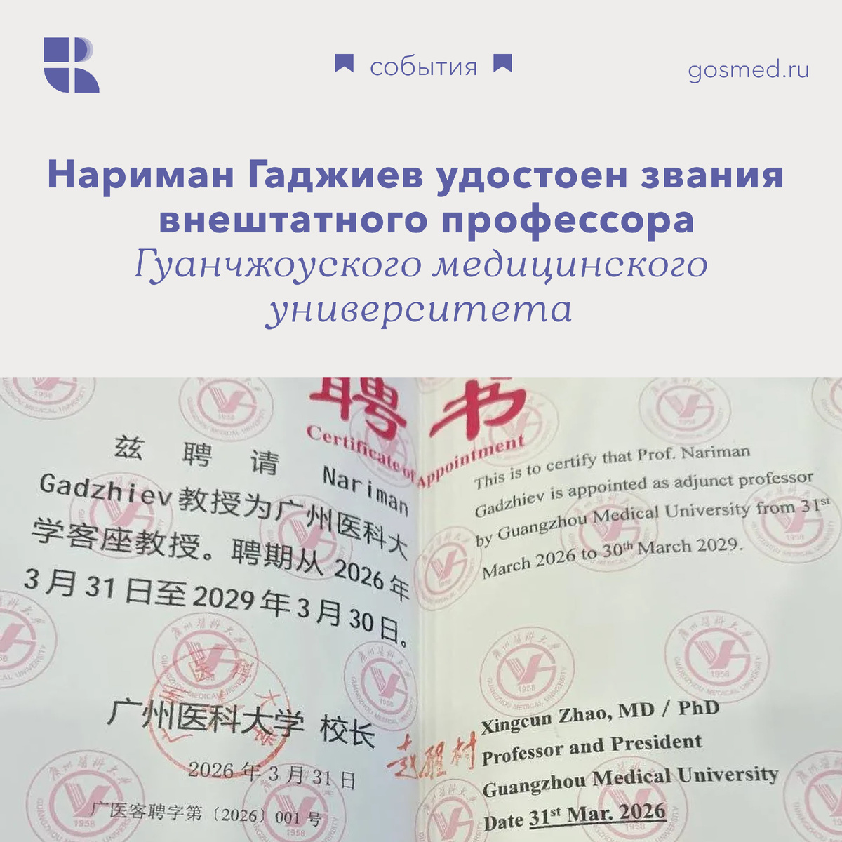 В ходе очередного делового визита в Китай профессору Нариману Гаджиеву, заместителю главного врача Клиники высоких медицинских технологий им. Н. И. Пирогова СПбГУ, присвоено звание внештатного профессора Гуанчжоуского медицинского университета. В мировой практике статус adjunct professor получают ведущие специалисты, которые не являются штатными сотрудниками университета, но активно участвуют в его научной и образовательной деятельности. В Китае этого звания удостаиваются эксперты с докторской степенью и международным признанием. Гуанчжоуский медицинский университет входит в число ведущих медицинских вузов страны, и его решение — знак высокого профессионального доверия. Нариман Гаджиев на протяжении многих лет ведет совместную работу с профессором Цзэн Гохуа — признанным авторитетом в области малоинвазивного лечения мочекаменной болезни. В этом году одна из их статей, опубликованная в журнале European Urology, заслужила награду как исследование года. Инновационные результаты другого ма