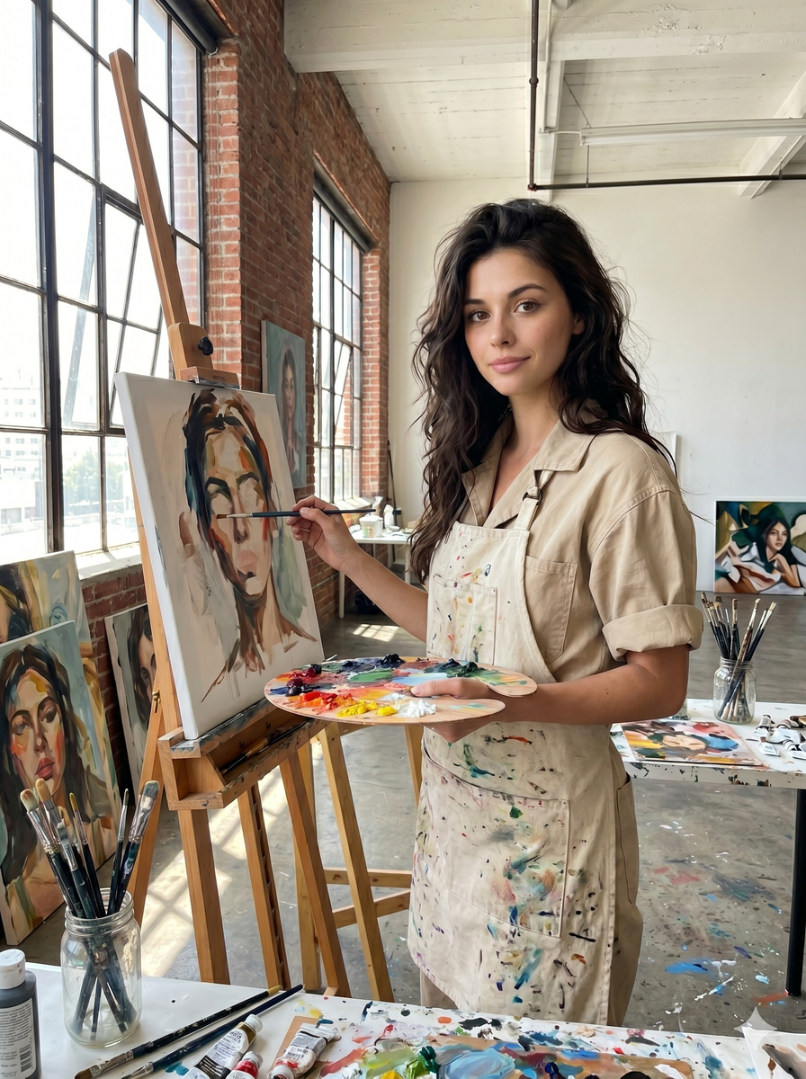 Сохрани черты лица человека с загруженного референсного фото в точности. Сохрани форму лица, глаза, нос, губы, тон кожи и все уникальные особенности. Девушка стоит в просторной художественной мастерской с высокими потолками и большими окнами. На ней свободный бежевый комбинезон с закатанными рукавами, поверх — холщовый фартук с пятнами краски. Она держит в одной руке палитру с яркими масляными красками, в другой — тонкую кисть, которой касается холста на мольберте. На холсте виден незаконченный абстрактный портрет. Вокруг расставлены другие полотна, банки с кистями, тюбики краски на деревянном столе. На полу — брызги и потёки засохшей краски. Стены из неоштукатуренного кирпича. Свет обильный, дневной, льётся из высоких окон слева, освещая лицо и создавая длинные тени от мольбертов по полу. Атмосфера творческая и вдохновлённая. Разрешение: минимум 2K. Лицо должно быть чётко видно.