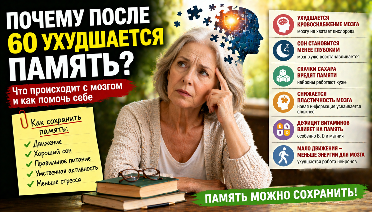 Это скорее замедление. Один из ключевых факторов. С возрастом: 👉 мозг получает меньше кислорода Что это даёт: Мозг умеет адаптироваться и создавать новые связи. Но после 60: 👉 поэтому информация запоминается хуже Очень частая причина. Во сне: Если сон плохой: Глюкоза — основной источник энергии для мозга. Но если: 👉 возникают скачки сахара Это приводит к: Особенно важны: 👉 при их нехватке: Мозг напрямую зависит от движения. Если мало активности: 👉 и мозг работает хуже Хронический стресс: 👉 в итоге память ухудшается Если мозг не используется: 👉 мозг «ленится», к