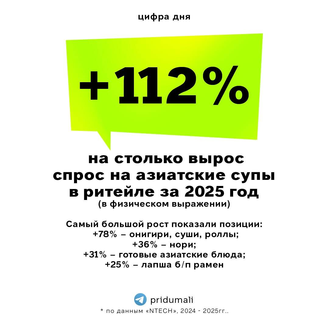 В рубрике «Цифра дня» данные NTECH — на 112% вырос спрос на азиатские супы в ритейле за 2025 год (по сравнению с 2024 годом). В ТОП-5 также попали позиции: 🟢онигири, суши, роллы (78%) 🟢 нори (36%) 🟢готовые азиатские блюда (31%) 🟢лапша б/п рамен (25%) Небольшой рост показали азиатские соусы (+16%), соевый соус (+7%) и азиатские соленья (+2%). 👉ПРИДУМАЛИ фуд-медиа в 🕊Telegram и Max #исследования