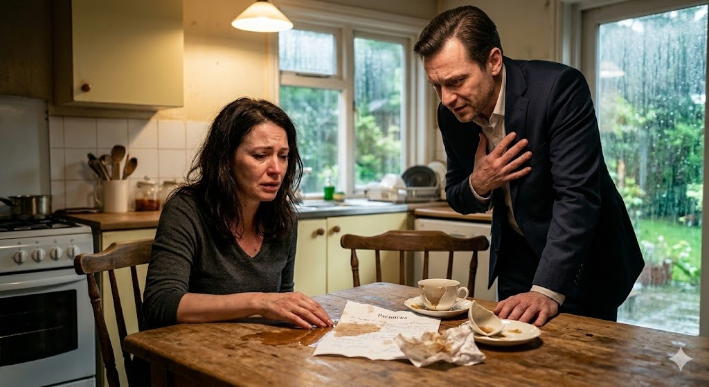 Виктор стоял у стола, держась за сердце. Лицо его исказила гримаса боли. Но не это приковало взгляд Елены. Чашка с горячим чаем, до краев наполненным заваркой и лимоном, была опрокинута прямо на расписку. Темная жидкость стремительно расплывалась по бумаге, размывая чернила.