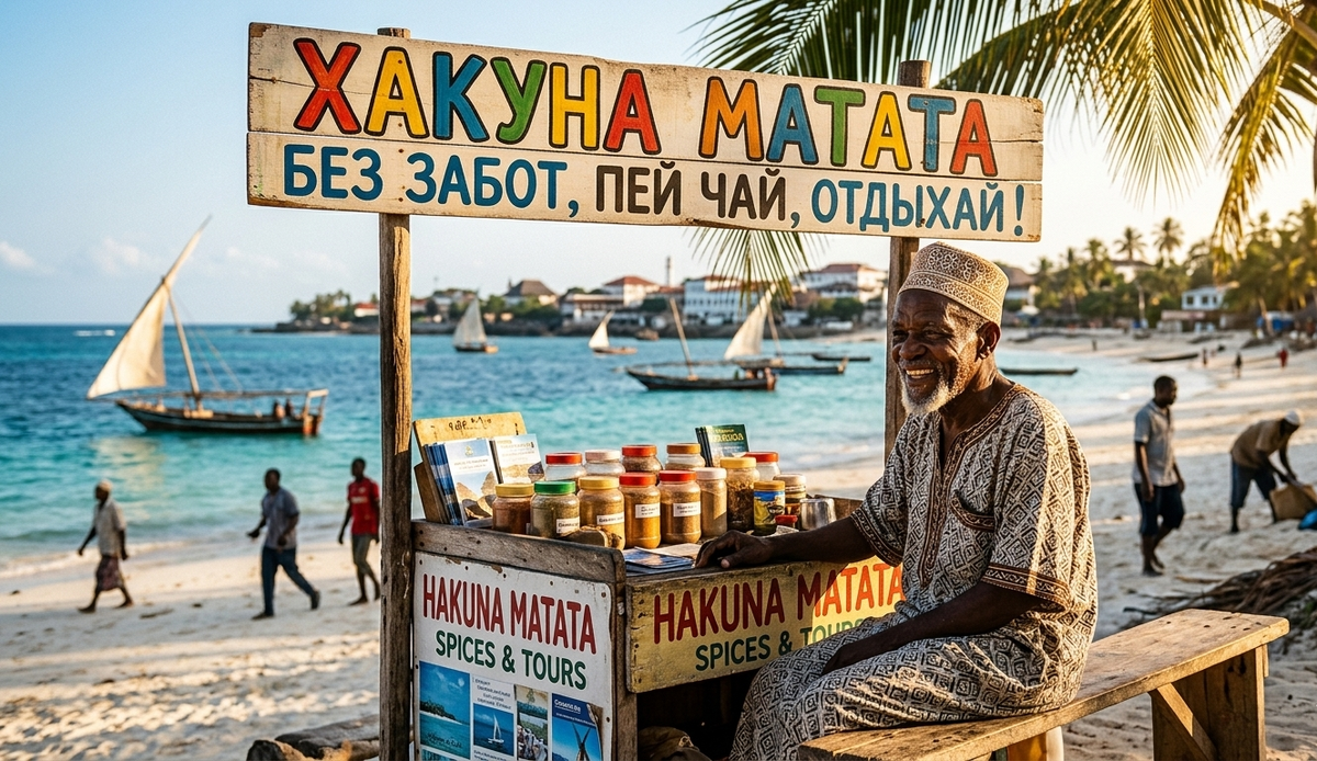 «Акуна матата» (Hakuna matata) — здесь всё честно. «Хакуна» означает «нет» или «не существует», «матата» — «проблемы», «неприятности». Полная фраза переводится как «нет проблем» или «всё в порядке». Это не выдуманное киношное выражение — его реально используют в повседневной речи в Танзании, Кении и на Занзибаре.