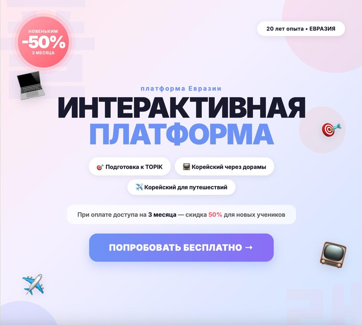 ! 🚀🇰🇷 Забудь про скучные учебники и бесконечные таблицы. В школе «Евразия» мы объединили 20-летний опыт преподавания и топовые технологии, чтобы твой путь к TOPIK был в кайф. ✨ Что такое обучение на нашей платформе? — Геймификация: проходи уроки как уровни в игре. — Умные тренажеры: запоминай слова в 3 раза быстрее. — Контроль 24/7: твой прогресс всегда перед глазами. — Живой контент: учи язык на примерах из дорам и K-pop хитов. 👉 Для новых и продолжающих учеников на платформе Евразии — скидка 50% при оплате на 3 месяца. ✉️ Пишите ПЛАТФОРМА нашему куратору в бот: @Eurasia_online_help_bot – подберём курс под тебя лично и запишем на БЕСПЛАТНЫЙ пробный урок.