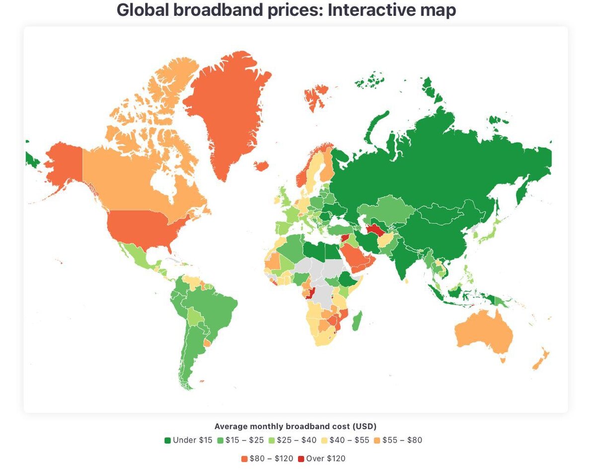 Cвежий рейтинг цен на интернет по миру. А внутри интересный парадокс. Самый дешёвый интернет — не там, где больше денег. А там, где проще архитектура и дешевле экономика. Иран — около 2,6 доллара в месяц. Северная Америка — почти 100 долларов. В частности США — около $80. Почему у богатых стран интернет дороже? А потому что интернет — это не про уровень страны. Это про то, как у тебя построена сеть. Если у тебя старая инфраструктура, куча легаси, дорогое обслуживание и регуляция — будет дорого. Даже если у тебя в стране супер развитый рынок. Если ты строил сеть позже и сразу на оптике — будет дешевле. Даже если ты не топ-экономика. Поэтому Восточная Европа стабильно в топе по доступности. Поздно начали — зато сделали нормально. Но дальше начинается более важная история. Цена — это только верхушка айзберга. Есть ещё доступ и контроль. Тот же Иран — дешёвый интернет. Но при этом ограничения, отключения, фильтрация. И получается интересная штука. Можно платить 2 доллара и сид