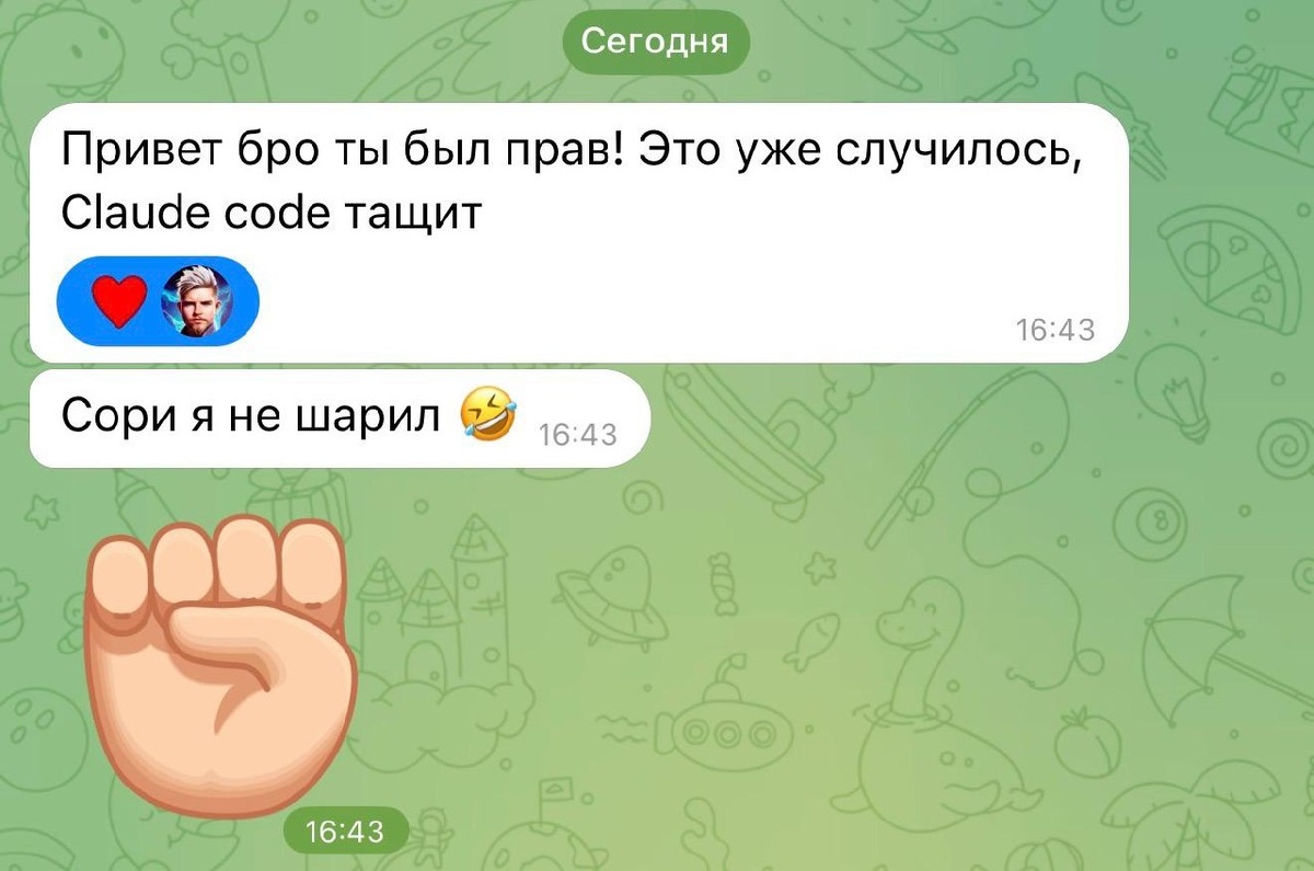 Как будто остался в 60-м году» Месяц назад на Бали мы с другом спорили на кухне. Он проджект по дизайну большого сервиса монтажа (вам известного). Мой тезис был про то, что его работу уже точно через агентов можно делать. Он в ответ - «фигня, пробовал, проще людям отдать, большой проект не спилишь…» классика) Сегодня прилетает скрин выше! И голосовое следом: «Я так немного пошукал по своим контактам, коллегам. Там просто такого уровня проекты реализовываются уже, что ощущение, как будто я замерз и остался в каком-то шестидесятом году. Все уже шагнули вперёд. Этим пользуются все. Это позволяет сделать такое, что я даже описать словами не могу - насколько это масштабно. И что будет дальше - это просто вау» Читаю и ловлю мурашки. Потому что это не новичок пишет. Это человек, который индустрию видит изнутри. ⚡️А «замерзают» обычно те, кто пропустил момент. Я сам этот момент чувствую последние месяцы остро. Каждая неделя - новый сдвиг. Уже не «новая нейросеть вышла» (а она вышла🥲)