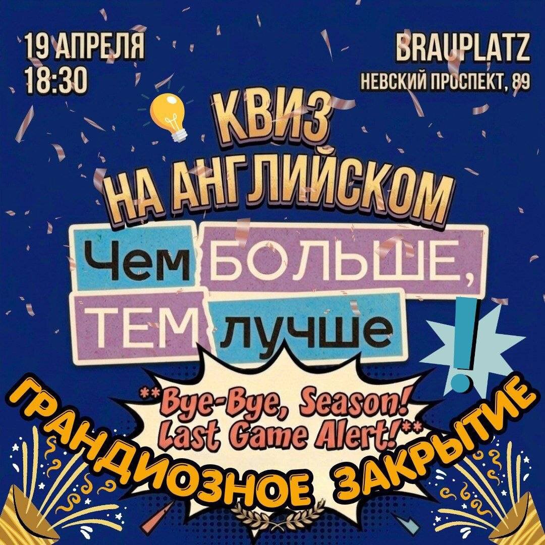 В этом cезоне у нас было невероятное количество классных игр, жарких споров и искреннего смеха. Мы стали одной большой семьей, но пришло время сказать друг другу «до свидания» (по крайней мере, в этом сезоне). Этот финал будет особенным! Победителям достанется эксклюзивный приз, который наш ведущий Сэм специально оставил в Петербурге перед отъездом. Что это? Узнаете на игре! 📍 Где: Brauplatz, Невский пр., 89 ⏰ Когда: 19 апреля в 18:30 🎫 Билеты по ссылке ТУТ. 💥 SEASON FINALE: TIME TO SAY GOODBYE This season has been filled with so many amazing games, sharp wits, and brilliant memories. We’ve grown into a real community, but now it’s time to say "see you soon" as we wrap up this season. This finale comes with a twist! The winners will receive a special prize that our host Sam left behind in St. Petersburg just for this occasion. Curious what it is? Come and find out! 📍 Where: Brauplatz, Nevsky Pr. 89 ⏰ When: April 19th at 18:30 🎫 Get your tickets here.