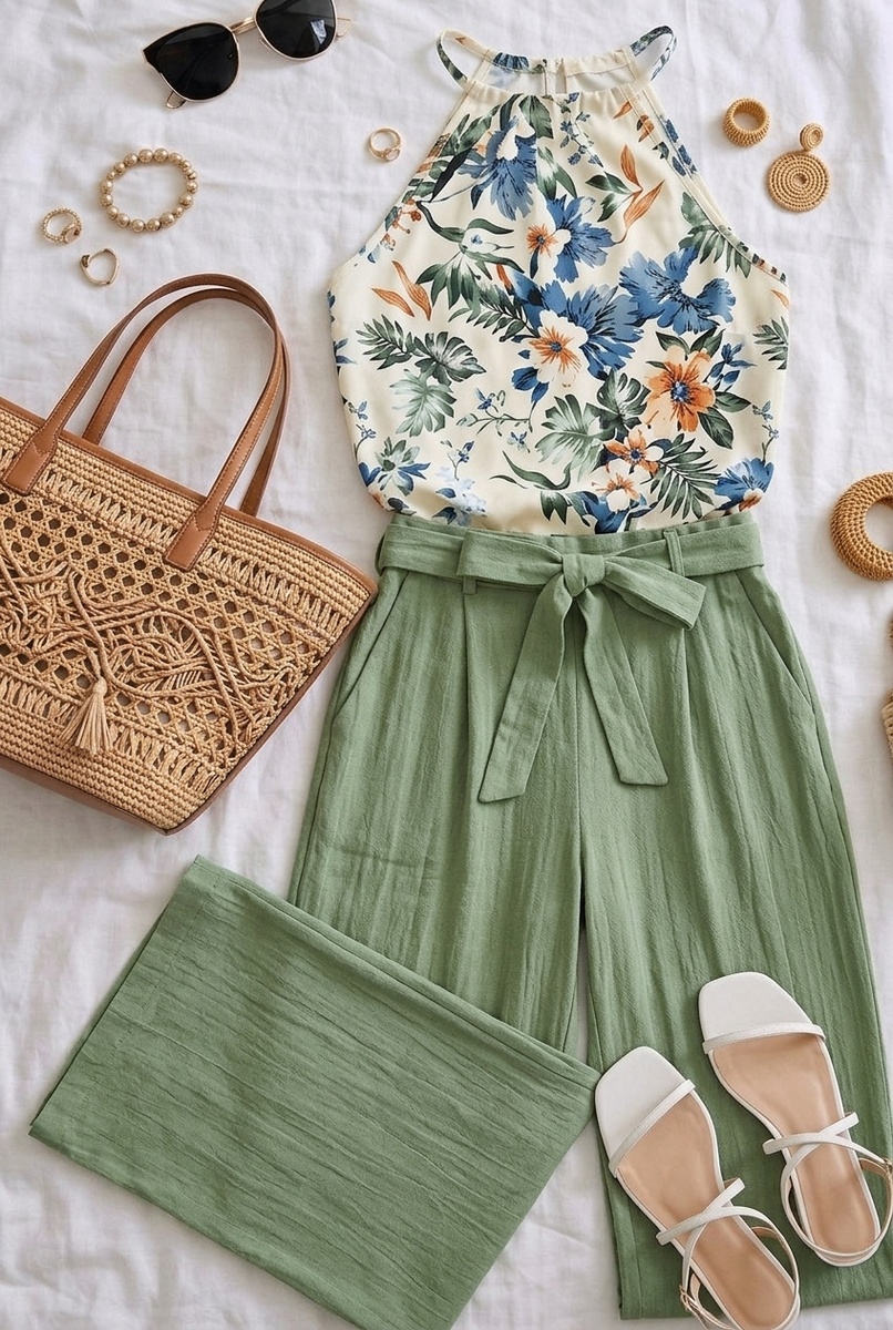 Я серьёзно подсела на костюмы с Wildberries. Удобно, красиво и не нужно долго думать, что надеть. Делюсь пятью образами, которые отлично подойдут для этого лета. Этот образ выглядит как будто собран из двух разных вещей - и именно в этом весь смысл. Топ с тропическим принтом в голубых и оранжевых тонах плюс оливковые широкие брюки с завязкой на талии. Яркий верх красиво открывает плечи и шею - это один из самых выгодных фасонов для лета. Оливковый низ отлично гасит яркость принта и не даёт образу выглядеть слишком пёстро. Аксессуары я выбрала простые, чтобы не перегружать принт. Сумка - большая соломенная с объёмным плетением и кожаными ручками. Такие сумки сейчас везде, и я понимаю почему: лёгкая, вместительная, подходит к половине гардероба. Обувь - белые сандалии на тонком ремешке с небольшим квадратным каблуком. Они вытягивают силуэт и добавляют чуть больше элегантности, чем обычная плоская подошва. Этот комплект базовый и это говорит само за себя. Топ с баской и широкие прямые бр
