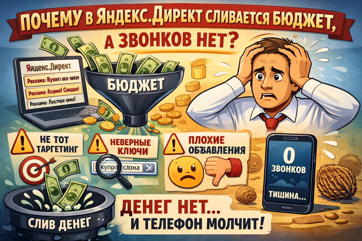 Если вы тратите 50 000, 100 000 или 300 000 рублей в месяц на контекстную рекламу, а телефон молчит — эта статья для вас. Разберём все 14 причин, по которым Директ «съедает» деньги без заявок, и покажем, как получать клиентов без ежедневной оплаты за клики.