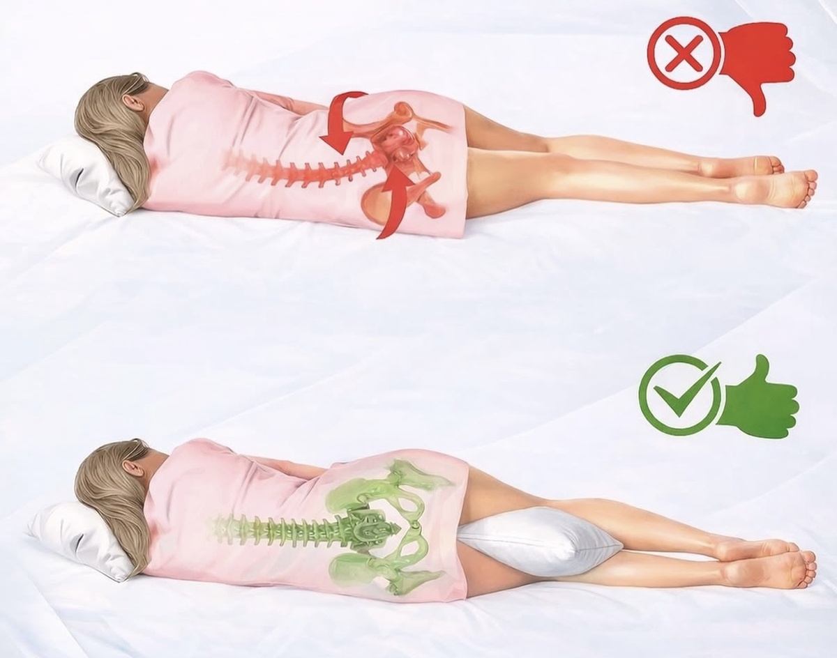 Посмотрите на картинку к этому посту. На первом изображении – классическая поза на боку, когда одна нога лежит на другой. На первый взгляд удобно, но с точки зрения анатомии это