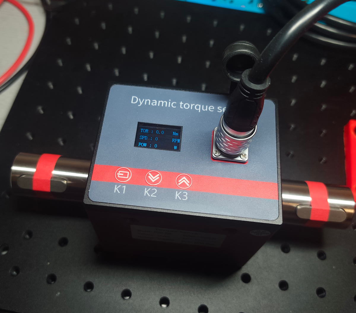 Питание 24В, потребление у меня получилось 140мА. Максимальная скорость заявляется в 15000об/мин и гарантируемая по точности не более 10000об/мин. Есть небольшой экран, показывающий собственно крутящий момент со знаком, скорость вращения вала без знака и механическую мощность, полученную из двух предыдущих величин, так же без знака. Аналоговый выходной сигнал момента вращения может быть из вариантов: ±5V/0-10V/4-20mA Сигнал скорости вращения частотно-импульсный (60 импульсов на оборот). Цифровой выход RS485. Можно использовать Modbus RTU протокол. Можно настроить режим который просто шлет по RS485 данные о моменте и/или скорости непрерывно. Есть несколько вариантов настроек этого. Я попробовал и так и так, работает и по запросам и непрерывно. Есть оригинальное ПО для ПК которое строит графики с него, может что еще умеет, стоит 87 баксов, тут можно и взять, а можно и