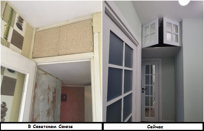 Антресоли стали настоящим спасением для крохотных хрущевок, в которых каждый метр пространства был на счету. Когда строители заметили, что место между потолком и верхнем краем двери пропадает, он решили использовать его для хранения. Первоначальная конструкция была примитивной и выглядела совсем не эстетично: два бруска, лист ДСП и дверцы из фанеры. Зато она получилась вместительной: туда смело влезал чемодан, запасные постельные принадлежности (подушки, одеяла), запас консервации и пр.
