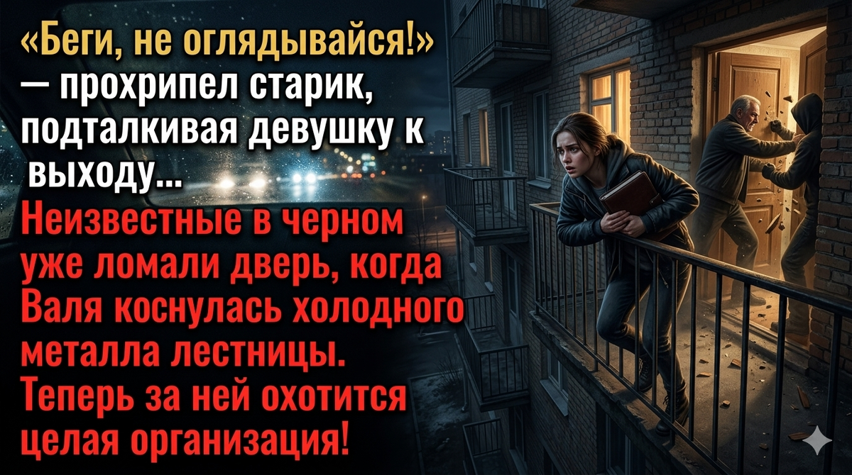 — Пожарная лестница справа, за выступом, — быстро шептал старик, помогая ей перелезть через перила. — Спускайтесь до третьего этажа, там козырек магазина. Прыгайте на газон и бегите к арке. Там будет ждать серая машина. Водитель знает, что делать.