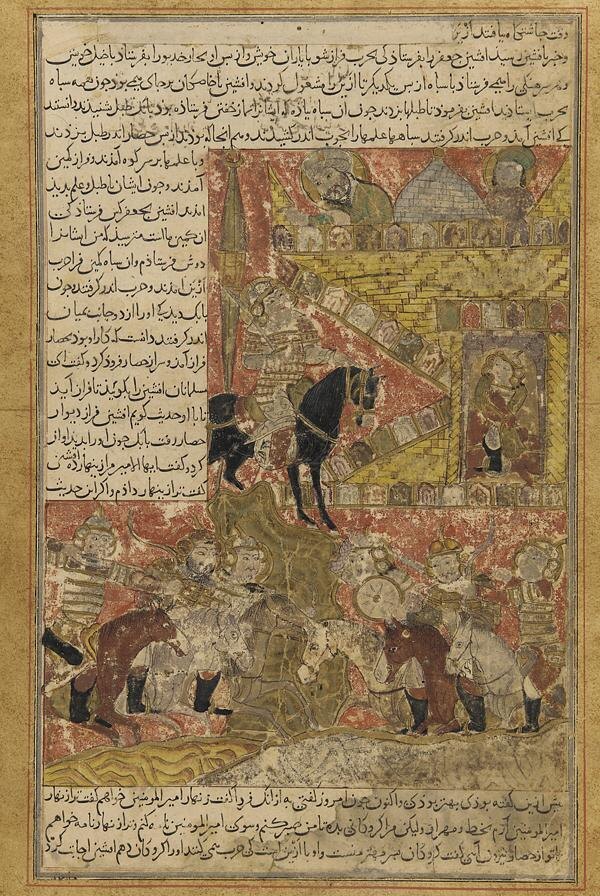 From Babak Khorramdin to the Samanid Iranianate: the Iranization of Islam; above: Babak Khorramdin in negotiations with Al-Afshin (from a folio of the Tarikh nameh (Book of History) by Balami; below: silk textile, probably a saddle-cloth, made for Abu 'l-Mansur Bukhtegin, a general under the Samanid ruler Abd al-Malik I (known as the Suaire de Saint-Josse, Paris, Louvre, OA 7502)