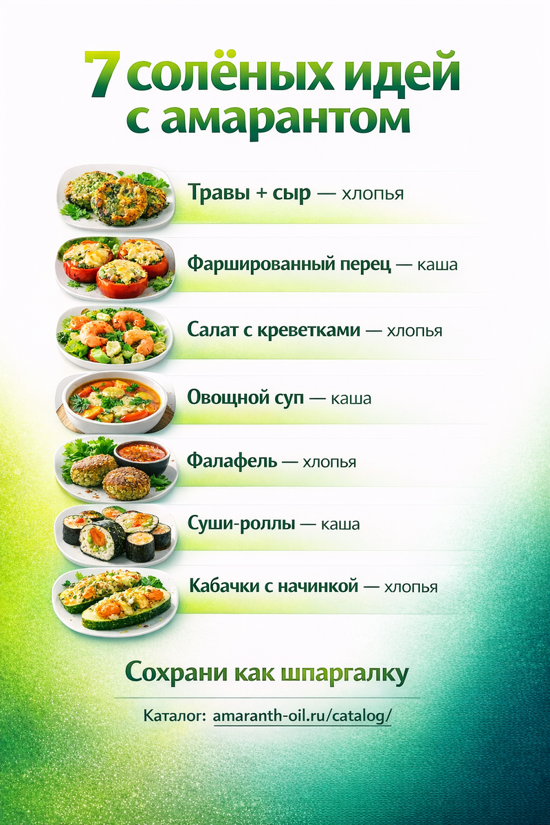 Поэтому самый удобный путь — брать реальные рабочие форматы и мягко встраивать в них продукты ВЭИК: немного амарантовой муки, немного хлопьев, часть крупяной основы или амарантовое масло уже в готовую тарелку.