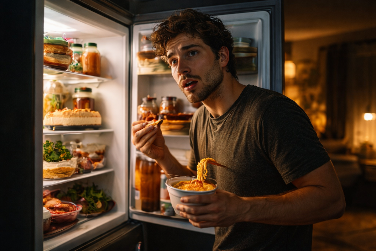 Ты уже лёг, выключил свет и почти заснул. И вдруг появляется мысль: "может, что-нибудь съесть". Через пару минут ты уже стоишь у холодильника и смотришь внутрь, хотя прекрасно знаешь, что там лежит. Знакомо? Почему днём ты спокойно проходишь мимо еды, а ночью это превращается в отдельный ритуал? В течение дня ты постоянно в движении. Работа, переписки, задачи, дорога - внимание всё время чем-то занято. Даже если появляется лёгкое чувство голода, ты его легко игнорируешь. Просто нет времени остановиться и прислушаться. Но ночью всё меняется. Становится тихо, нет отвлечений, экран гаснет, и ты остаёшься наедине с собой. И вот тут вдруг всплывает это ощущение: "что-то хочется". Хотя днём ты этого даже не замечал. Самое интересное, что ночью редко хочется нормальной еды. Никто не мечтает о супе или гарнире. Тянет на простое: сладкое, хрустящее, что-то знакомое. То, что быстро даёт удовольствие и немного успокаивает. После длинного дня мозг ищет лёгкий способ переключиться. И еда становится
