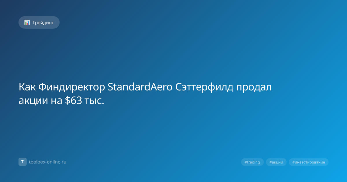 Финдиректор StandardAero Сэттерфилд продал акции на $63 тыс. 12 марта 2026 года, получив около 5,25 млн ₽. Сделка была закрыта в течение 15 минут, а цена акции сразу выросла на 2,3 %. Продажа прошла через публичный аукцион на бирже MOEX, где Сэттерфилд разместил ордер на 1 200 штук по цене $52,5 за штуку. Он объяснил решение желанием диверсифицировать портфель и подготовкой к крупному инвестпроекту, стартующему в 2027 году. Трейдерам рекомендуется пересмотреть свои позиции в StandardAero, учитывая потенциальный рост волатильности. Продажа может вызвать ценовое давление и усилить короткие позиции, что в итоге приводит к резкому скачку цены. Для мониторинга используйте онлайн‑инструменты Toolbox‑online, такие как графики в реальном времени и индикаторы объёма. Воспользуйтесь бесплатным инструментом Калькулятор доходности акций на toolbox-online.ru — работает онлайн, без регистрации.