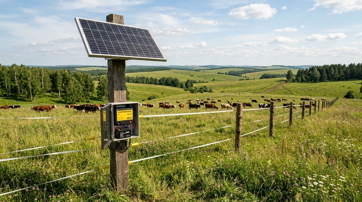 Треть пастбищ в России расположена далеко от ближайшей розетки. Тянуть кабель на 2 км — дорого. Возить аккумулятор на зарядку каждые две недели — утомительно. Солнечные электропастухи решают эту проблему: поставил один раз — работает весь сезон без вашего участия. Конструкция проста: 1. Солнечная панель (3–20 Вт) заряжает встроенный аккумулятор 2. Аккумулятор (6–12 В) хранит энергию 3. Генератор импульсов берёт энергию из аккумулятора и подаёт на забор Днём панель заряжает батарею. Ночью и в пасмурную погоду генератор работает от накопленного заряда. Хороший солнечный электропастух запасает энергии на 3–5 пасмурных дней подряд. • Энергия: 0,71 Дж • Панель: 6 Вт • АКБ: 12 В (в комплекте) • Три режима: солнце / АКБ / сеть 220 В • Покрытие: до 35 км (без растительности), реально 5–8 км • Плюс: универсальность — работает от любого источника • Цена: от 22 000 руб. • Энергия: 2,0 Дж • Панель: 10 Вт (моно) • АКБ: 12 В, 12 Ач • Покрытие: до 60 км • Плюс: мощный для солнечной модели, HTE-техно