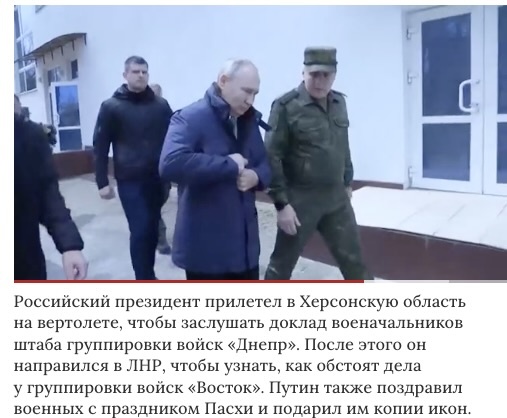 18 апреля 2023 года президент РФ приехал в штаб группировки войск «Днепр», поздравил военнослужащих с Пасхой и подарил икону «Спас Нерукотворный».