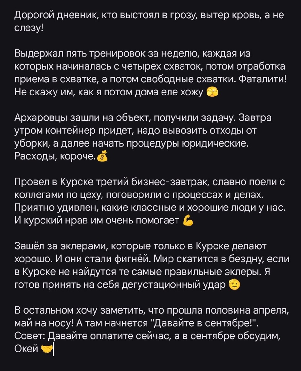 ! Выдержал пять тренировок за неделю, каждая из которых начиналась с четырех схваток, потом отработка приема в схватке, а потом свободные схватки. Фаталити! Не скажу им, как я потом дома еле хожу 🫣 Архаровцы зашли на объект, получили задачу. Завтра утром контейнер придет, надо вывозить отходы от уборки, а далее начать процедуры юридические. Расходы, короче.💰 Провел в Курске третий бизнес-завтрак, славно поели с коллегами по цеху, поговорили о процессах и делах. Приятно удивлен, какие классные и хорошие люди у нас. И курский нрав им очень помогает 💪 Зашёл за эклерами, которые только в Курске делают хорошо. И они стали фигнёй. Мир скатится в бездну, если в Курске не найдутся те самые правильные эклеры. Я готов принять на себя дегустационный удар 🫡 В остальном хочу заметить, что прошла половина апреля, май на носу! А там начнется "Давайте в сентябре!". Совет: Давайте оплатите сейчас, а в сентябре обсудим, Окей 🤝