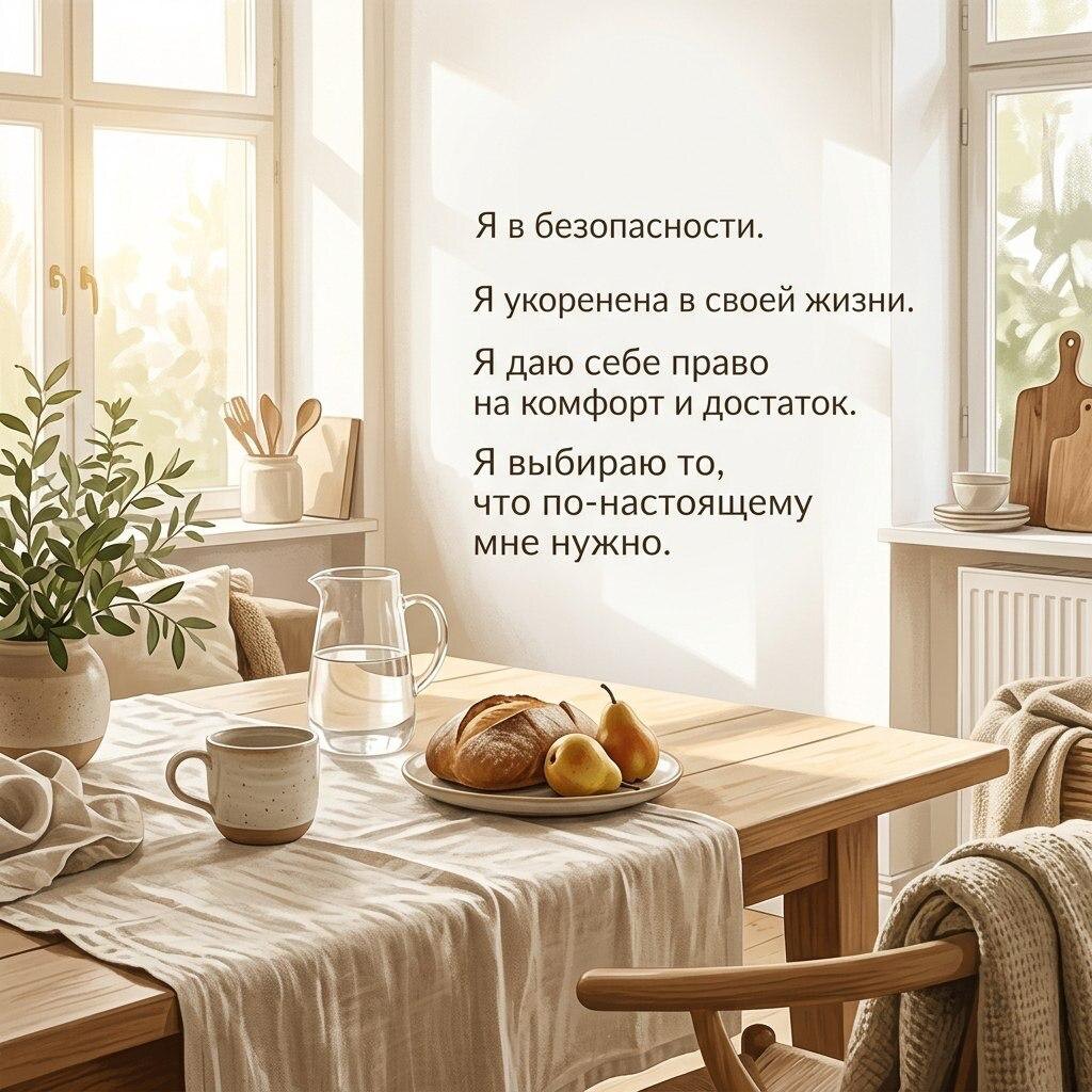 Сегодняшний день — уютный дом, в котором только начинают обживаться. Не всё еще расставлено по местам, но в нём есть главное: чувство, что здесь будет хорошая жизнь. Здесь не очень много вещей, но они добротные и надежные. На уютной кухне накрыт красивый деревянный стол. Вокруг — только самое нужное, и оно всегда под рукой. Телесный ключ к пространству — замедлиться и вернуться в тело, потому что пространство этого дня открывается не через мысли, а через ощущение опоры, дыхания и границ собственного тела. Когда мы возвращаем внимание в дыхание, в кожу, в вес своего тела, в контакт с полом, внутри появляется чувство «я здесь», а вместе с ним — безопасность, ясность и укоренённость.